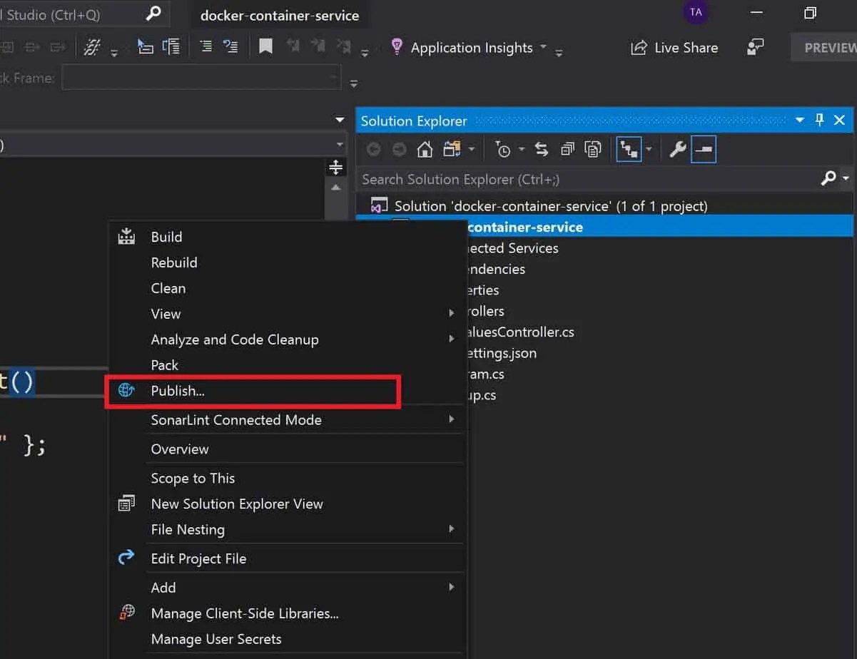 Let’s now publish the application as shown below. All the binaries once published successfully will be located in the working directory “docker-container-service\bin\Release\netcoreapp2.2\publish“